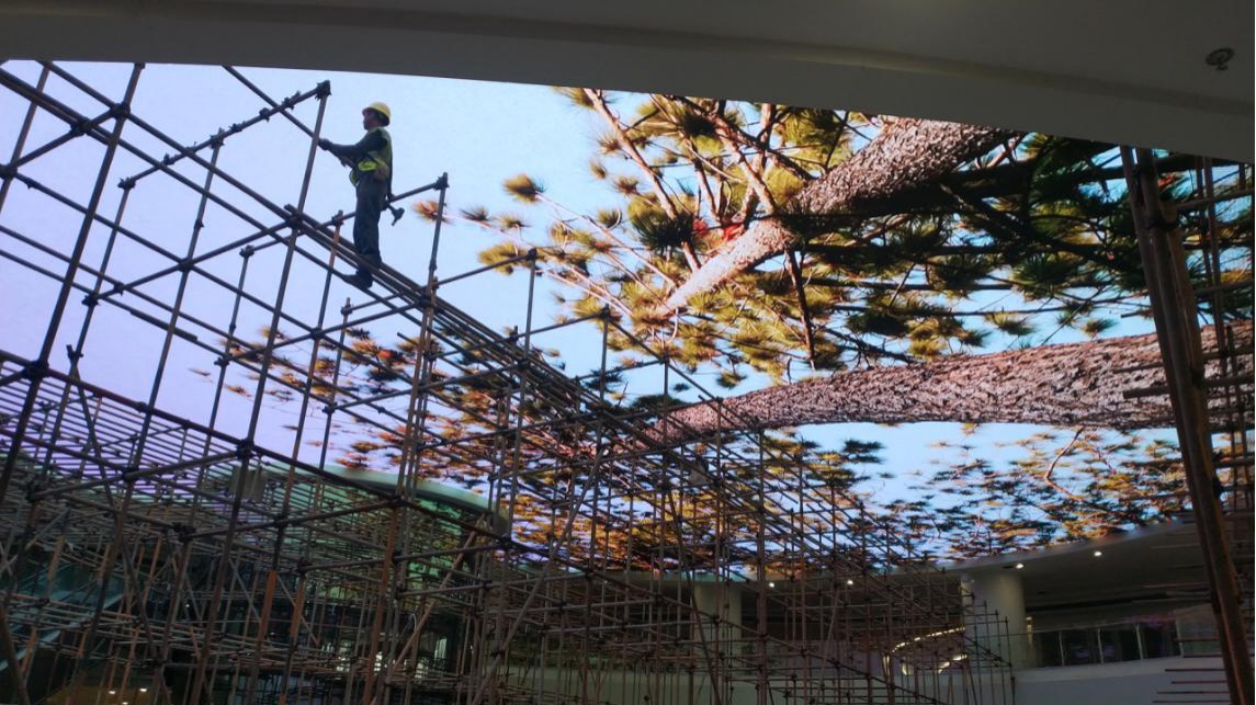 該LED天幕屏項目位于常州工人文化宮,LED天幕尺寸為最大直徑33米的圓形屏,共800多平方,專業(yè)定制無帽檐面罩,模組整體鍍膜,模組與模組之間安裝蝴蝶扣,另加了超強磁鐵。